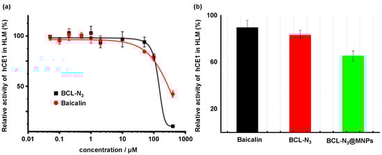Evaluation of biological activity. (a) Inhibitory rate of baicalin and BCL-N3 towards hCE1 in HLMs; (b) relative inhibitory activity of 25 μM baicalin, BCL-N3 and BCL-N3@MNPs (counted on BCL-N3) towards hCE1 in HLMs.