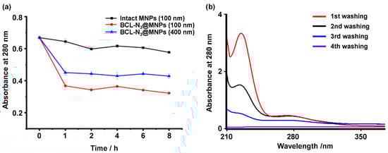 The optimization of protein capturing. (a) The absorbance at 280 nm of residual proteins in the supernatant of the mixtures of protein extracts from HEK293 cells incubated with different MNPs for various incubation times; (b) the absorbance at 280 nm of proteins washed off from 100 nm BCL-N3@MNPs which were incubated with protein extracts from HEK293 cells for 2 h.