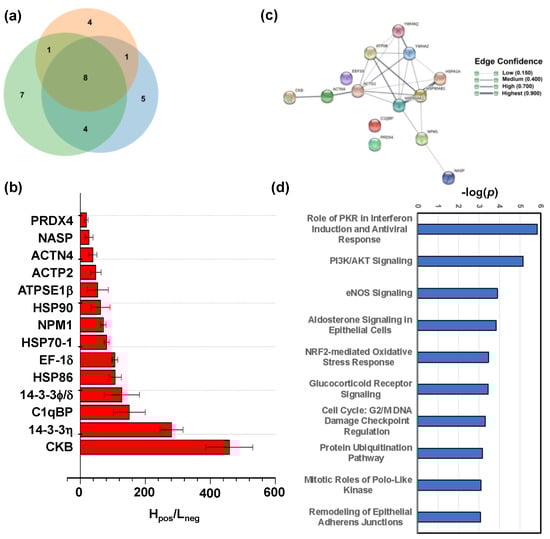 Next, we used the baicalin functionalized nanoparticles (BCL-N3@MNPs) to capture proteins that interact with baicalin from the protein extract of HEK293 cells, and then identified the proteins by quantitative mass spectrometry (qMS) analysis following the method reported previously by us [,], while the intact MNPs were used as negative probes to rule out the proteins nonspecifically absorbed on MNPs. The protein fishing and nano LC-MS/MS analysis were performed in three replicates independently. In total, 14 proteins were identified in at least two parallel experiments (Figure 6a), and had an average ratio of Hpos/Lneg > 18, where Hpos represents the sum of intensity of all tryptic peptides assigned to a protein captured by the positive probes, and Lneg indicates the sum of intensity of all tryptic peptides assigned to the same protein pull-down by the negative probes (Figure 6b). The detailed MS data of all identified proteins are listed in Table S1 in the Supplementary Materials.