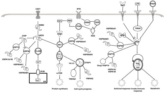 To further understand the biological activity of baicalin, we applied the Ingenuity Pathway Analysis (IPA) program to enrich the core signaling pathways with which the target proteins of baicalin are associated. The results showed that the target proteins are mostly associated with the role of PKR in interferon induction and antiviral response signaling pathway (P = 10−6) among the top 53 core signaling pathways (Figure 6d and Table S2). PKR is a double-stranded RNA-activated protein kinase, and can be activated by viral infection, playing a key role in the inflammasome [] and in controlling viral spreading with the host []. The heat shock proteins, HSP90 and HSP70, and the nuclear protein NPM1 are all involved in regulation of PKR signaling (Figure 7). This implies that the binding of baicalin to these proteins may contribute to its antiviral and anti-inflammatory activities.