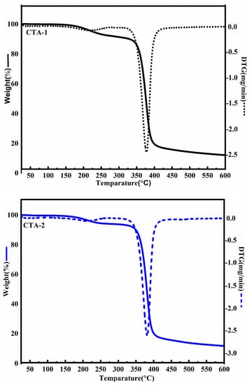 - Barud, H.S.; de Araújo Júnior, A.M.; Santos, D.B.; de Assunção, R.M.N.; Meireles, C.S.; Cerqueira, D.A.; Rodrigues Filho, G.; Ribeiro, C.A.; Messaddeq, Y.; Ribeiro, S.J.L. Thermal behavior of cellulose acetate produced from homogeneous acetylation of bacterial cellulose. Thermochim. Acta 2008, 471, 61–69. [Google Scholar] [CrossRef]