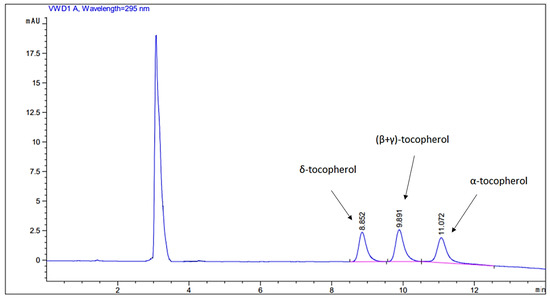 Prior to the isolation of the tocopherols, a MAE protocol was employed for oil extraction [39]. Approximately 1 g of lyophilized sample was extracted using a mixture of acetone (2:1 v/v, 5 mL), at a microwave power of 420 W and temperature of 80 °C for 30 min. After extraction, the solvent was distilled with a rotary evaporator at 60 °C. The oil was collected. For the extraction of tocopherols, a modified version of a previously reported protocol [40] was applied using 20 mg of oil dissolved in 1 mL of ethanol in a 2 mL Eppendorf tube. The mixture was vortexed for 1 min at 3000 rpm and then centrifuged for 10 min at 12,000 rpm. The supernatant was collected and filtered through 0.22 µm PTFE syringe filters and 20 µL was injected into the HPLC system.