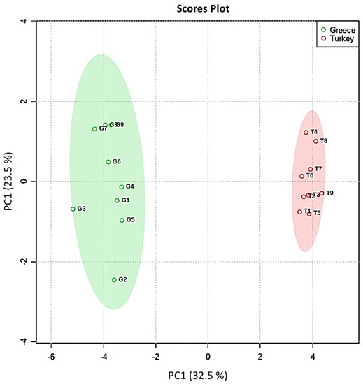 PCA was employed to explore distribution of the samples and formation of groups on the basis of the concentrations of the determined bioactive compounds. The data matrix consisted of eighteen pistachio samples originating from Greece and Turkey and sixteen features (the concentration results of phenolics and tocopherols). The MetaboAnalyst package was used for PCA, and the data matrix was auto-scaled [37]. Figure 3 presents the score plot and it is observed that the samples clustered into two individual groups according to the country of production. The pistachio nuts originating from Greece were grouped into the green ellipse, and those produced in Turkey were grouped into the red ellipse. The first two principal components (PCs) explained 55% of the total variance, establishing two individual groups of samples according to the country of production. The biplot presented in Figure S1 graphically shows, using the loadings, the effects of the variables in each PC.