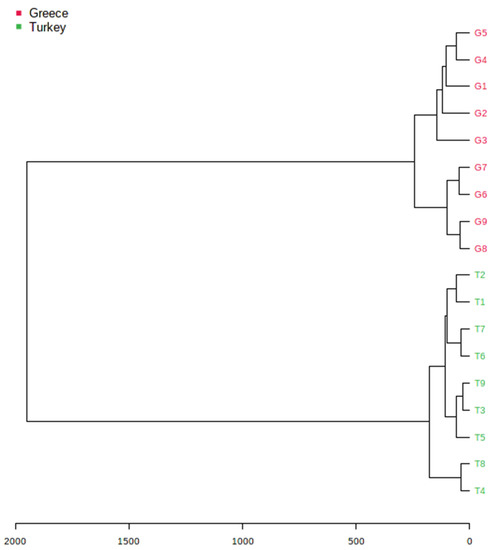 AHC was employed as a cluster analysis method to build a hierarchy of clusters in a tree diagram (also known as a dendrogram) to identify samples that present similarities and to group all of the objects that share similar characteristics into a large cluster [37]. The dendrogram presented in Figure 4 shows that the observations clustered into two major groups, one which was comprised of all of the pistachio samples produced in Greece (G1–G9), and a second one which comprised all of the samples originating from Turkey (T1–T9).