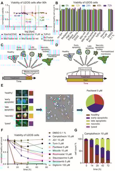 Figure 1. Validation of cell staining dyes and optimization of High-Via Protocol. (A) Healthy cell count after 90 h of cell staining dye exposure at six different concentrations and 10 µM of staurosporine in U2OS cells. Vertical lines show optimal concentration used in subsequent assays (Hoechst33342 60 nM (ThermoFisher, Waltham, MA, USA), MitoTracker TM red 75 nM (Invitrogen, Waltham, MA, USA), MitoTracker TM far red 75 nM (Invitrogen, Waltham, MA, USA), YoPro3 1 µM (Invitrogen, Waltham, MA, USA), BioTracker Microtubule 3 µM (EMD Millipore, Burlington, MA, USA). Error bars show SEM of four technical replicates. (B) Healthy cell count 0 h, 12 h, 24 h, 48 h and 72 h after cell staining dye exposure alone or in combination (Multiplex: Hoechst33342 60 nM, BioTrackerTM Microtubule 3 µM, MitoTracker TM red 75 nM, Annexin V Alexa Fluor 680 0.3 µL/well; HighVia Extend: Hoechst33342 60 nM, MitoTracker TM far red 75 nM, YoPro3 1 µM, Annexin V Alexa Fluor 488 0.3 µL/well) and 10 µM of staurosporine (stauro) normalized to healthy cells exposed to DMSO 0.1% in U2OS cells. Error bars show SEM of four technical replicates. (C) Generic workflow of cell gating in HighVia protocol. (D) Generic workflow of cell gating in HighVia Extend protocol. (E) Cellular classification in healthy, early apoptotic, late apoptotic, necrotic and lysed by trained cell biologist. Cellular classifications shown after segmentation using a machine learning algorithm. Fractions of healthy, early apoptotic, late apoptotic, necrotic and lysed cells after 24 h of 5 µM paclitaxel exposure in U2OS cells. (F) Healthy cell count before and 14 h, 28 h, 42 h and 72 h after compound exposure (camptothecin 10 µM, JQ1 10 µM, torin 5 µM, paclitaxel 5 µM, milciclib 10 µM, ricolinostat 10 µM, staurosporine 5 µM, berzosertib 5 µM, digitonin 100 µM) normalized to healthy cells exposed to DMSO 0.1% in U2OS cells. Error bars show SEM of technical triplicates. (G) Fractions of healthy, early apoptotic, late apoptotic, necrotic and lysed cells before and 14 h, 28 h, 42 h and 72 h after 10 µM camptothecin exposure in U2OS cells. Error bars show SEM of technical triplicates.