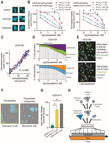 Figure 2. Analysis of Cell Nuclei by Hoechst Channel Intensity level. (A) Nuclei classification in healthy, pyknosed and fragmented by trained cell biologist. (B) Normalized healthy cell count and normalized healthy nuclear count of different concentrations (0.01 µM, 0.05 µM, 0.1 µM, 0.5 µM, 1 µM, 5 µM, 10 µM) of camptothecin exposure with calculated IC50 values after 14 h, 28 h, 42 h and 56 h. (C) Correlation between the healthy cell count and the healthy nuclei count after 28 h of compound exposure normalized to healthy cells exposed to DMSO 0.1% in U2OS cells. (D) Fractions of HighVia gating and fractions of healthy, fragmented and pyknosed nuclei after exposure to different concentrations (0.01 µM, 0.05 µM, 0.1 µM, 0.5 µM, 1 µM, 5 µM, 10 µM of camptothecin in U2OS cells after 56 h of compound exposure. Error bars show SEM of three technical replicates. (E) Fluorescence image of different gatings of U2OS cells exposed to 1 µM camptothecin after 56 h based on total cell morphology and based on nuclei. (F) Bright field confocal image of stained (blue: DNA/nuclei, green: Annexin V apoptosis marker, red: YoPro3, magenta: Mitotracker Deep Red, mitochondria content) U2OS cells after 24 h of compound exposure (itraconazole 10 µM, berzosertib 1 µM). Precipitation of 10 µM itraconazole and fluorescence of 1 µM berzosertib exposure shown as Hoechst High Intensity Objects are highlighted. (G) Hoechst High Intensity Objects after 24 h of compound exposure (itraconazole 10 µM, berzosertib 1 µM) and DMSO 0.1% as negative control. Error bars show SEM of three technical replicates. (H) Generic workflow of cell gating based on cell nuclei.