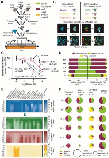Figure 3. FUCCI Cell Cycle Assay. (A) Gating scheme of the machine learning-based analysis of the HCT116-FUCCI reporter cell line (B) Example images of HCT116 cells treated either with 10 µM vinorelbine tartrate or 0.1% DMSO for 42 h. Highlighted by colored lines are the gating results of both the nuclear gating step into “healthy”, “pyknosed” and “fragmented” nuclei and the FUCCI gating step of ‘healthy’ nuclei only. (C) Cytotoxicity of milciclib for HCT116-FUCCI at different time points assessed by the normalized healthy cell count. The depicted IC50 values are the average and SEM of two independent experiments. (D) Population distribution of ‘healthy’ gated (based on nuclear features) HCT116-FUCCI cells treated with 1 µM milciclib or 0.1% DMSO for different periods. (E) Heat map analysis of HCT116-FUCCI cells treated with 10 µM of different inhibitor for different time points. (F) Detailed representation of the population fractions of HCT116-FUCCI cells exposed to 10 µM of trametinib, mitoxantrone and HI-TOPK-032. The size of the pie charts reflected the normalized cell count. For comparison, the fractions of DMSO are shown as well.