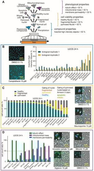 Figure 4. High Content Multiplex screen of different compounds in U2OS cells. (A) General workflow of Multiplex High Via protocol analysis with property thresholds. (B) Ratio of Hoechst High Intensity Objects after 24 h of compound exposure (Supplementary Table S5) in U2OS in comparison to DMSO 0.1% of biological duplicates. Error bars show SEM of technical triplicates. Property threshold at 50% marked red. For example, fluorescence confocal images of stained (blue:DNA/nuclei, Hoechst33342) U2OS cells after 24 h of exposure to camptothecin 10 µM in comparison to DMSO 0.1%. (C) Cell count ratio of different Nuclei gating after 24 h of 10 µM of compound exposure (Supplementary Table S5) in comparison to DMSO 0.1% in U2OS cells. Error bars show SEM of technical triplicates. Property threshold at 50% marked red. Brightfield confocal image of stained (blue: DNA/nuclei, green: Microtubule different, red: mitochondria content, magenta: Annexin V apoptosis marker) U2OS cells after 24 h of compound exposure of staurosporine 10 µM) in comparison to DMSO 0.1%. Gating of cells for Nuclei gating and Annexin V based gating shown. (D) Cell count ratio of tubulin effect (green), mitochondrial mass increase (magenta) and membrane permeability (blue) of U2OS cells after 24 h of 10 µM of compound exposure (WM-1119, TP-030-1, NVS-MALT-1, SR-302, α-naphthoflavone, vinorelbine tartrate, digitonin, milciclib, SR-318, BAY-179) in comparison to DMSO 0.1%. Error bars show SEM of technical triplicates. Property threshold at 50% marked. Brightfield confocal image of stained (blue: DNA/nuclei, green: microtubule different, red: mitochondria content, magenta: Annexin V apoptosis marker) U2OS cells after 24 h of compound exposure (vinorelbine tartrate 10 µM, milciclib 10 µM, digitonin 10 µM) in comparison to DMSO 0.1%. Fluorescent image of different staining is highlighted.