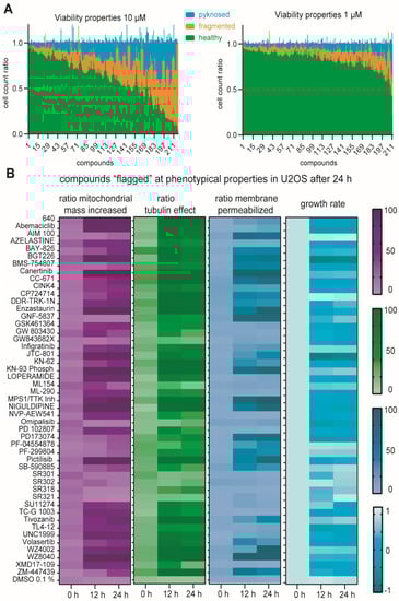 Figure 5. Multiplex Certificates of Chemogenomic Compounds. (A) Cell count ratio of different nuclei gating after 24 h of 10 µM and 1 µM of compound exposure (Supplementary Table S8) in U2OS cells. Error bars show SEM of biological duplicates. Healthy nuclei count at 50% (viability threshold) marked as a red line. (B) Heat map of phenotypical property ratios (tubulin effect, mitochondrial mass increased and membrane permeabilized) and the growth rate, which was calculated against the non-treated cell number, as described earlier by Hafner et al. [61] of U2OS cells exposed to 49 compounds, that were marked as ‘flagged’ after Multiplex analysis (phenotypical property threshold > 50%). Heat map shows meaning of two biological duplicates. All data are available in Supplementary Table S8.