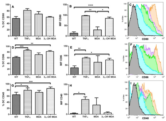 DCs Costimulatory molecules after a treatment with MDA or 3α-OH MDA. The levels of the CD40, CD80, and CD86 costimulatory molecules were measured DCs after a treatment with MDA or 3α-OH MDA. WT: without treatment group and positive control of maturation: TNFα. 3α-OH MDA induces an increased CD80 and CD86 expression and also increased levels of CD40- and CD86-positive DCs. When these cells were treated with MDA, a CD40 increased expression was observed, although no significant differences were observed. (A) Percentage of CD80+ DCs after the treatment. (B) Mean CD80 fluorescence intensity (MIF). * p = 0.03, ** p = 0.005, **** p < 0.0001. (C) Histogram of DCs showing the expression of CD80. Gray: isotype control; Aqua: without treatment (WT: immature DCs); Orange: TNFα; Green: MDA; Purple: 3α-OH MDA. (D) Percentage of CD86+ DCs after the treatment. ** p = 0.0052, *** p = 0.0005. (E) CD86 MIF for DCs. * p = 0.040, ** p = 0.0043. (F) Histogram of DCs showing the expression of CD86. Gray: isotype control; Aqua: without treatment (WT: immature DCs); Orange: TNFα; Green: MDA; Purple: 3α-OH MDA. (G) Percentage of CD40+ DCs. * p = 0.05, *** p = 0.0005. (H) CD40 MFI for DCs. * p = 0.05. Mean ± SEM n > 3. (I) Histogram of DCs showing the expression of CD40. Gray: isotype control; Aqua: without treatment (WT: immature DCs); Orange: TNFα; Green: MDA; Purple: 3α-OH MDA.