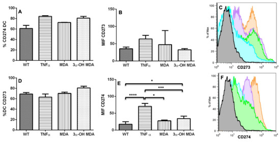 DCs coinhibitory molecules after the treatment with MDA or 3α-OH MDA. The levels of the CD273 and CD274 coinhibitory molecules were measured in DCs after treatment with MDA or 3α-OH MDA. WT: without treatment group and positive control of maturation: TNFα. 3α-OH MDA increased the expression of CD274, although TNFα mediated the highest expression of CD274. (A) Percentage of CD273-positive DCs. (B) Mean CD273 fluorescence intensity (MIF) for DCs. (C) Histogram of DCs showing the expression of CD273. Gray: isotype control; Aqua: without treatment (WT: immature DCs); Orange: TNFα; Green: MDA; Purple: 3α-OH MDA. (D) Percentage of CD274-positive DCs. (E) CD274 MIF for DCs. * p = 0.03, *** p < 0.0005, **** p < 0.0001. Mean + SEM n ≥ 3. (F) Histogram of DCs showing the expression of CD274. Gray: isotype control; Aqua: without treatment (WT: immature DCs); Orange: TNFα; Green: MDA; Purple: 3α-OH MDA.
