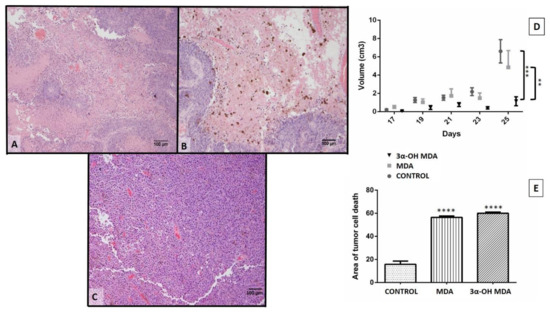 Histopathological analysis and tumor growth rate after a treatment with DCs previously incubated with 3α-OH MDA or MDA. Histological tumors micrographs of mice inoculated with DCs previously treated with MDA (A) or 3α-OH MDA (B) and untreated mice (C). Tumors from untreated mice showed abundant tumor cells and blood vessels. Conversely the MDA and 3α-OH MDA groups showed extended tumor cell death areas consisting of eosinophilic areas (dead cells) and some basophilic areas of active tumor cells. Tumor growth rate changes were measurable up to 25 days after melanoma inoculation. (D) Graph showing tumor growth rate in mice treated with DCs previously incubated with MDA or 3α-OH MDA. Mice treated with DCs/3α-OH MD showed the lowest tumor growth rate. Mice inoculated with DCs/MDA showed no differences when compared to the control group. Mean + SEM n ≥ 10. ** p < 0.05 Control vs. 3α-OH MDA, *** p < 0.0046 MDA vs. 3α-OH MDA. (E) Graph showing the change of cell death areas in tumors from mice treated with DCs previously incubated with MDA or 3α-OH MDA. **** p < 0.0001, 3α-OH MDA vs. Control, MDA vs. Control. Mean + SEM n ≥ 10.