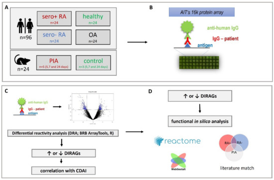 Study design. (A) sample cohort: 96 samples from RF- and CCP-positive (sero+), RF- and CCP- negative (sero-) RA, osteoarthritis and healthy human individuals and 24 samples from time-course pristane induced arthritis (PIA) and control animals were investigated. (B) IgG isolated from plasma was probed on AIT’s 16k microarray. (C) Data obtained from microarray scans was subjected to differential reactivity analysis (DRA) and correlation analysis with clinical disease activity index (CDAI) using BRB ArrayTools and RStudio elucidating differentially reactive antigens (DIRAGs) which were subsequently (D) in silico analyzed for dysregulated pathways.