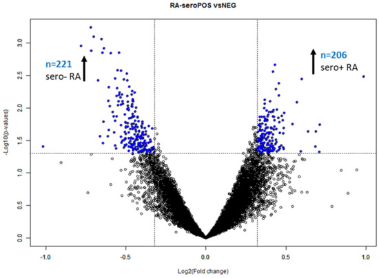 Volcano plot of seropositive versus seronegative RA. The unblocked class comparison elucidated n = 382 significant (p < 0.05) DIRAGs with a fold-change > 1.25 (−0.3219 and 0.3219 on the log2 scale, indicated as dashed line in the plot above). DIRAGs above the significance thresholds are indicated in blue (BRB ArrayTools [8] output per default). The sign of the fold-change is assigned in alphabetical order; hence, proteins higher reactive in seropositive RA are located on the left side of the plot.