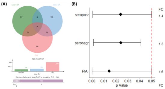 Intersection of significant higher reactive DIRAGs as Venn Diagram (A) and their respective p-values and the average fold-change as a forest plot (B). Results of the blocked analysis of the comparison seropositive versus seronegative RA was used, and PIA 7 vs. 24 days after correction for DIRAGs higher reactive in PBS animals. VennDiagram created with JVenn [9].