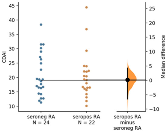 The median difference between seronegative RA and seropositive RA is shown in the above Gardner–Altman estimation plot. Both groups are plotted on the left axes; the mean difference is plotted on a floating axis on the right as a bootstrap sampling distribution. The mean difference is depicted as a dot; the 95% confidence interval is indicated by the ends of the vertical error bar. The unpaired median difference between seronegative RA and seropositive RA is 0.2 [95.0%CI −6.45, 4.25]. The p value of the two-sided permutation t-test is 0.9 (calculation and plot generated by https://www.estimationstats.com (accessed on 30 December 2021) according [41].