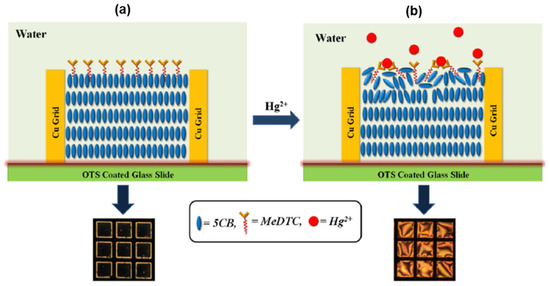 The second format is a sandwich format that simply involves another glass slide that is placed on top of the TEM grid assembly of the first format, such that the LC and analyte recognition/interaction molecules are sandwiched between two glass plates before being immersed in the analyte solution [21,22,26]. In both first and second formats, the LC molecules can adopt a homeotropic alignment (vertical orientation) with respect to the glass substrate or they may adopt a planar orientation, depending on the environment or chemical composition surrounding the LC molecules. LCs have a birefringence property, which could be observed with a polarized optical microscope [5,33]. Thus, the setup is observed under cross polarizers in an optical microscope, where the homeotropic alignment of the LCs appears dark and planar orientation appears bright. Dark or bright field in the optical response is dictated by the chemical composition or interaction at the LC/aqueous interface. Usually, the sensing mechanism is an optical transition from a dark to a bright image or vice versa when the sensor is immersed in the analyte solution and viewed under cross polarizers with an optical microscope. As depicted in Figure 1, the sensor assembly of 5CB molecules doped with MeDTC was applied to copper grids. The MeDTC was added to the LC because it can self-assemble at the LC/aqueous interface and induce a homeotropic anchoring of 5CB. This homeotropic alignment of the LC molecules gives a dark image as shown. However, when immersed in a solution of Hg(II) ions, the ions interact with the dithio-chelating group in the MeDTC and this interaction disrupts the homeotropic alignment of the 5CB liquid crystal at the LC-water interface, resulting in a bright image.