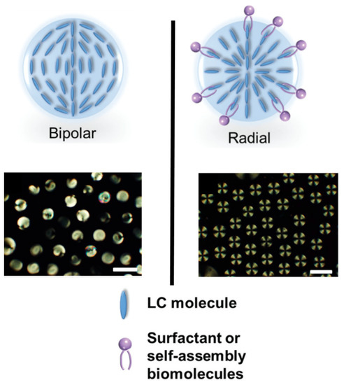 The third format involves aqueous droplet interfaces where microdroplets of LCs are suspended in bulk water [22,34]. Biomolecules can cause the reorientation of LCs in the microdroplet due to the absorption from surfaces of LC droplets [22]. In this format, the size of the droplet is an important determinant of sensitivity since the large surface-area-to-volume ratio of LC microdroplets enables full reaction at the LC/aqueous interface thereby producing a lower detection limit [35]. Furthermore, the configuration of the LCs depends on the diameter of the droplet, typically around 10–100 µm [36,37,38]. Ordering of LC molecules can produce either a radial or bipolar configuration, again depending on the chemical composition of the environment. In a manner similar to the dark versus bright images obtainable in the first two formats, this format presents either radial or bipolar image and the optical response can be from one configuration to the other (Figure 2). Any one of the three formats is usually employed for LC-based sensing systems. It should be mentioned that almost all (if not all) the LC-based sensors make use of polarized optical microscopy (POM) image as the detection method.