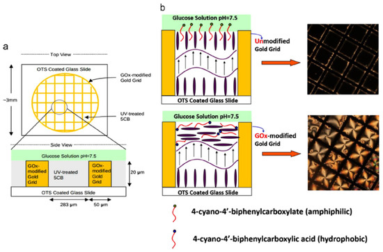Schematic of enzymatic glucose sensor showing the gold grid on OTS-treated glass slide (a). The sensing mechanism (b): pH is maintained at 7.5 in the absence of GOx and so no changes in H+ concentration and dark image is obtained (top panel); with GOx-modified gold grid, glucose is oxidized and increased H+ concentration triggers a homeotropic to planar orientation of the LCs due to protonation of carboxylate ion. Reprinted with permission from ref. [48]. 2014 Elsevier.