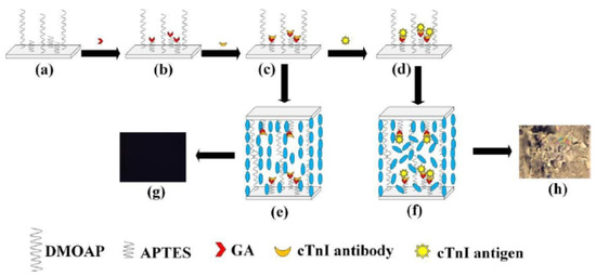 Schematic showing a protein (cTnI) LC-based sensor involving 5CB in a sandwich format. (a) Treatment of glass slide with DMOAP/APTES); (b) addition of crosslinking agent, GA; (c) immobilization of CnTI antibody; (d) reaction with CnTI antigen; (e) homeotropic LC alignment due to step (c); (f) antigen biding disrupts the alignment of LC molecues; (g) dark image due to step (e); and (h) bright image due to step (f). Reprinted with permission from ref. [51]. 2020 The Royal Society of Chemistry.