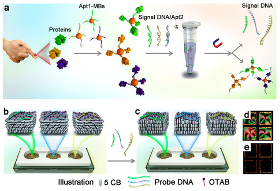 - Qi, L.; Liu, S.; Jiang, Y.; Lin, J.-M.; Yu, L.; Hu, Q. Simultaneous Detection of Multiple Tumor Markers in Blood by Functional Liquid Crystal Sensors Assisted with Target-Induced Dissociation of Aptamer. Anal. Chem. 2020, 92, 3867–3873. [Google Scholar] [CrossRef]