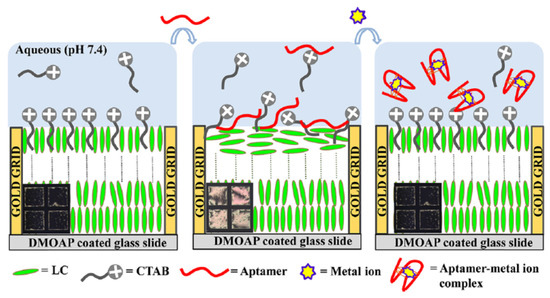 Using UV-treated 5CB confined in urease-modified gold grid immersed in urea solution to produce ammonium and hydroxide ions, Hu and Jang used Cu(II) as a model heavy metal ion to inhibit the action of urease on urea and thereby keeping the original orientation of the LC [124]. However, they observed a planar to homeotropic transition in the absence of Cu(II). Han and Jang also reported a LC-based heavy metal ion sensor using stearic acid-doped 5CB droplet patterns spontaneously generated on an OTS-coated glass substrate by evaporation of a heptane solution of the LC in the nematic state [72]. At a pH of 8.1, the heavy metal ions of copper (II) and cobalt (II) interacted with the deprotonated stearic acid thereby disrupting self-assembled acid at the LC-aqueous interface and giving a dark to bright transition of the POM image. Furthermore, Du et al. reported a LC-based sensor for the detection of lead (II) ions using aggregation-induced emission (AIE) luminogens [71]. Detection is based on variation in the fluorescence intensity generated by disrupting the LC alignment at the LC/aqueous interface when Pb(II) ions were present. This disruption is caused by a Pb(II)-specific DNAzyme incorporated on DMOAP/APTES treated glass substrate and it gave a fairly low detection limit of 0.65 nM compared to other similar Pb(II) detection methods. Similarly, Verma and coworkers developed a LC-based Pb(II) sensor on the basis of an aptamer-target binding event [73]. They used spinach RNA as a recognition probe. Using a cationic surfactant of CTAB and spinach RNA aptamer, there is an orientational transition of the 5CB molecules at the LC/aqueous interface from the planar to homeotropic state as a result of the formation of a more stable quadruplex structure of the RNA with Pb(II) in preference to the less stable CTAB-RNA complex (see Figure 6). This sensor offers a detection limit of 3 nM, which is about six times higher than that reported by Du and coworkers. Using surfactant-stabilized NiFeO4 nanoparticles, Zehra et al. reported a label-free LC-based sensor for Pb(II) [125]. They observed a homeotropic to planar transition for the LC molecules at the LC/aqueous interface in the presence of Pb(II), which interacts with abundant OH groups on the surface of the nanoparticles inducing a disruption of the LC alignment. They reported a detection limit of 100 ppb. Hong et al.used an aptamer as the recognition moiety in developing a Hg(II) ion LC-based sensor [126]. Using LC droplets consisting of OTAB surfactant with 5CB in the presence of an aptamer specific for Hg(II), they observed a planar to homeotropic orientational transition of the LC in the presence of the heavy metal ions induced by the weakening of OTAB-aptamer electrostatic interactions by the Hg(II) ions. In the same vein, Singh and coworkers developed a label-free Hg(II) sensor based on MeDTC-doped 5CB [27]. In the presence of Hg(II) ions, a dark to bright transition of the POM image was observed. This was due to a rapid complexation between the chelating group of MeDTC and Hg(II) ions, which disrupted the LC alignment at the LC/aqueous interface. A report has also presented the use of a LC-based sensor for the detection of calcium ions in water, whereby the PAA chains of PAA-b-LCP used to functionalize 5CB complexed with the metal ions, triggering homeotropic to planar transition [127].