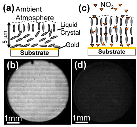 Due to their simplicity, low cost and ease of fabrication, LC-based sensors are now appearing in the literature for the detection of various gaseous substances, including toxic gases. For instance, nitrogen oxide (NO2), a ubiquitous environmental pollutant is toxic and prolonged exposure to it can lead to death. A LC-based sensor has been reported for this gaseous pollutant by Sen and coworkers [77]. Using LC film supported on a gold-coated substrate, the sensor is able to adsorb NO2 and the transport of NO2 molecules to the gold surface induces the orientational transition of the LC molecules at the LC–gold interface (Figure 7). The sensor is selective for NO2 only while it does not respond to other atmospheric gases over the course of 200 s. Furthermore, a LC-based sensor has been reported for sensing carbon monoxide gas (CO) by using a LC doped with magnetite (Fe3O4) nanoparticles and intercalated into porous alumina (Al2O3) [79]. The interaction between CO and the nanoparticles dispersed in the LC is the basis for the sensing mechanism. According to the authors, this interaction causes a shift in the selective reflection peak wavelength, which is proportional to CO concentration, which they estimated to be 0.85 nm/(mg/m3) in air. A highly selective and sensitive optical sensor based on LC has also been reported for ammonia gas [129]. Using chitosan-Cu(II)-decorated glass substrate, the alignment of 5CB on the substrate is disrupted due to competitive binding between ammonia gas and Cu(II) on the glass substrate, thereby causing the orientational transition of the LC molecules from homeotropic to planar state. A detection range of 50–1250 ppm was reported for this ammonia sensor with a detection limit of about 17 ppm.
