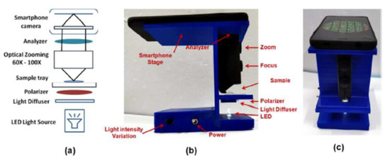 In a somewhat radical extension of what is possible with LC-based sensing, Cao and coworkers presented a machine learning (ML) framework for optimizing the specificity and speed of chemical sensors that are based on LCs [142]. They showed that ML algorithms can in fact unearth valuable information from orientational transitions induced by different gas-phase analytes and used such data to train accurate and automatic classifiers. Using the ML algorithm to classify thousands of optical images collected from LC responses, they showed that over 99% accuracy is possible with this ML approach compared to about 66% accuracy achievable by using the average brightness of optical images. Furthermore, Nandi and Pal developed a low cost, portable LC-based sensor using a smartphone as a detector [143]. The sensor is a 3D-printed device that used a smartphone for optical detection and its accuracy is similar to those based on POM images (Figure 8). They obtained detection limits of 5 and 10 nM, respectively, for Hb and BSA, and these results are similar to previous data reported from POM images.