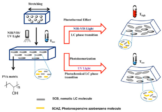 - Cheng, Z.; Wang, T.; Li, X.; Zhang, Y.; Yu, H. NIR–Vis–UV Light-Responsive Actuator Films of Polymer-Dispersed Liquid Crystal/Graphene Oxide Nanocomposites. ACS Appl. Mater. Interfaces 2015, 7, 27494–27501. [Google Scholar] [CrossRef] [PubMed]