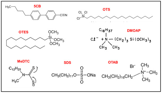 In general, three major formats are used in the fabrication of LC-based sensors. One format involves applying the LC molecules on specially treated glass substrates while suspending and confining them in transmission electron microscopy (TEM) grids, usually doped with LC/air interface assembly molecules and the whole unit is then immersed in a solution of the analyte. In some cases, an independent analyte recognition/interaction molecule may be added to the mix if the presence of the analyte is unable to perturb the LC alignment in a significant way with the original chemical composition. In many cases, the surfactants originally added to the sensor medium have the right chemistry that interacts with the analyte and triggers realignment of the LC molecules. Such analyte recognition/interaction molecule will trigger reorientation of the LC molecules in the presence of the analyte. However, if the analyte is absent, such reorientation will not take place. Treatment of the glass substrate is meant to provide primary ordering for the LCs. Chemicals such as octadecytrichlorosilane (OTS), N,N-dimethyl-N-octadecyl-3-aminopropyl trimethoxysilylchloride (DMOAP), or octadecyltrietoxysilane (OTES) may be used for this purpose [21,22,26,27]. LC/air interface assembly molecules are also added to the mix. These are usually surfactants or phospholipids, which are amphiphilic molecules with polar head groups and aliphatic alkyl chains [21,27]. Such molecules fall in the category of phospholipids, ionic and non-ionic surfactants and LC polymers. Examples include N-methyl-N-dodecyldithiocarbamate (MeDTC), sodium dodecyl sulfate (SDS), Tween-20, alkyl trimethylammonium bromide (CnTAB), octadecyltrimethyl ammonium bromide (OTAB), (hydroxyundecyl)trimethyl ammonium bromide (HTAB), tetra(ethylene glycol) monotetradecyl ether (C14E4), tetra(ethylene glycol) monododecyl ether (C12E4) and amphiphilic block copolymers such as poly(acrylicacid-b-4-cynobiphenyl-4-oxyundecylacrylate), i.e., PAA-b-LCP [21,27,28,29,30,31]. A previous review has presented the use of a variety of polyelectrolytes to functionalize the LC-aqueous interface, yielding an interesting and promising class of interfaces for applications in chemical and biological sensing [32]. The chemical structures of 5CB and selected chemicals used for treating glass substrates as well as LC/air interface assembly molecules are shown in Scheme 1 below.