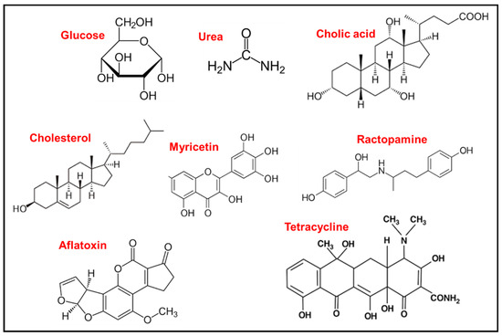 LC-based sensors have also been reported for myricetin, a naturally-occurring flavonoid. It is known to accelerate the degradation of single-stranded DNA (ssDNA) and double-stranded DNA (dsDNA) and has chemotherapeutic properties [120]. Using a 5CB-filled TEM grid cell functionalized with DTAB followed by spontaneous adsorption of DNA, Munir and Park developed a LC-based sensor for myricetin [120]. DNA adsorption changed the LC alignment from homeotropic to planar state due to electrostatic interaction between DNA and DTAB. However, when myricetin was injected into the TEM grid cell, planar orientation of the LC molecules changed to homeotropic alignment due to degradation of the DNA by myricetin. It was shown that the sensitivity of this sensor to myricetin was enhanced by metallic salts of Fe and Cu. A LC-based imaging sensor was also reported for ractopamine, a synthetic β-andrenergic agonist [121]. Using gold nanoparticles for signal enhancement, Wang et al. immobilized ractopamine aptamers on a treated glass slide and 5CB molecules were applied and a second treated glass slide was placed on top, making a sandwich arrangement. Gold nanoparticles with ractopamine adsorbed on them were then applied and this caused an orientational transition of the LC molecules from homeotropic to planar state, giving a dark to bright POM image transition. This sensor gave a ractopamine detection limit of 1 pM. Furthermore, a LC-based immunosensor was reported for the detection of aflatoxin, a toxic mycotoxin that is capable of causing several health problems [122]. This sensor used BSA-aflatoxin on the DMOAP/APTES-treated glass slide and 5CB was applied followed by aflatoxin antibody, giving a disordered arrangement of the LC molecules (i.e., nematic domains with randomly oriented optical axes). When target aflatoxin was added, however, competitive binding between the analyte and the BSA-aflatoxin conjugate for the antibody disrupts the LC orientation to give a homeotropic alignment. This sensor presented high specificity and a detection limit of 100 pg/mL. Similarly, a LC-based aptasensor has been reported for the detection of tetracycline, a broad-spectrum antibiotic [123]. 5CB-filled copper grid was placed on a DMOAP/APTES treated glass substrate that also contained adsorbed aptamer molecules, followed by another treated glass slide on top, giving a sandwich arrangement. In the absence of tetracycline, the LC molecules assume homeotropic alignment (dark POM image) while the addition of tetracycline disrupts the LC alignment due to interaction with the aptamer, thereby giving a bright POM image. A summary of all the sensors discussed in this section is presented in Table 1. Furthermore, Scheme 2 shows the chemical structures of selected analytes discussed in this section.