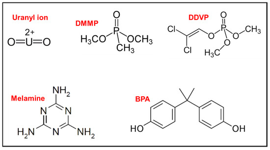 Chuang and Chen also reported a LC-based sensor for melamine [137]. Their sandwich sensor system works on the mechanism that melamine, if present, will bind with anti-melamine adsorbed on the glass substrate, which disturbs the LC orientation. Ren et al. has also reported a LC-based aptasensor for the detection of bisphenol A (BPA), an endocrine-disrupting chemical [26]. The BPA analyte forms a complex with the aptamer and this complex disrupts the orientation of the LC molecules from homeotropic to planar, i.e., dark to bright POM image transition. Such a transition is not evident when BPA is not present. They recorded a detection limit of 0.6 fM for BPA with this sensor. A summary of the sensors discussed in this section is presented in Table 3 while Scheme 3 presents the chemical structures of selected analytes in this section.