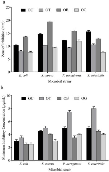 The antimicrobial activity was estimated as antibacterial potentials; the antibacterial activity of essential oils was estimated in terms of zone of inhibition (in millimeters) in agar-well diffusion assay and also as minimum inhibitory concentration. In the disc diffusion assay, O. gratissimum was the most effective against S. aureus and S. enteritidis and O. basilicum was most effective against P. aeruginosa strains. Against E. coli, both O. basilicum and O. gratissimum essential oils were most effective (Figure 1a). Corroborating these results, the minimum inhibitory concentration against these organisms were of a similar pattern, where both O. gratissimum and O. basilicum essential oils intercepted the proliferative ability of different bacteria (Figure 1b).