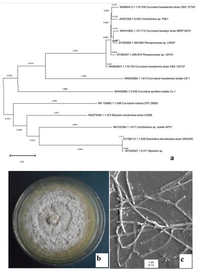 (a) Phylogenetic tree of the isolate Cochliobolus sp. APS1; (b) 8-day old colony of Cochliobolus sp. APS1 grown on PDA plates; (c) scanning electron micrograph of sterile hyphae.