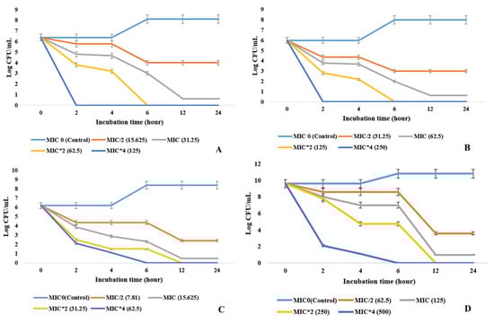 Killing kinetics of pathogenic microorganisms over time when treated with different concentrations of MIC values against pathogenic microorganisms: (A) S. aureus, (B) MRSA, (C) B. cereus, and (D) E. coli..