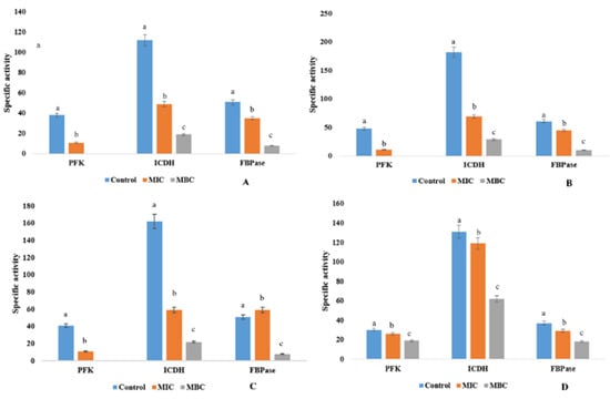 Change in the profile of central carbohydrate metabolic enzymes in pathogenic microorganisms upon treatment with ethyl acetate extract of APS1: (A) MRSA, (B) VRSA, (C) P. mirabilis, and (D) P. aeruginosa. Values on the graphs are the means ± Standard error (SE) of the three replicates. Tukey’s multiple comparison test was performed. The different letters a, b, and c in each case (Control, MIC and MBC values) represent a significant difference between them (At, p < 0.05).