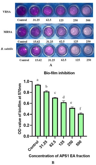 Biofilm inhibition by APS1 EA extract (A) against three pathogens (MRSA, VRSA, and E. coli) (crystal-violet-stained polystyrene plate showing bio-film formation as well as inhibition), (B) Change in OD values of the MRSA biofilm formation after treatment with different concentrations of the APS1 EA extract. Values on the graphs are the means ± Standard error (SE) of the three replicates. Tukey’s multiple comparison test was performed. The different letters a, b, c, d, e and f indicates significance difference in comparison to control (At, p < 0.05).