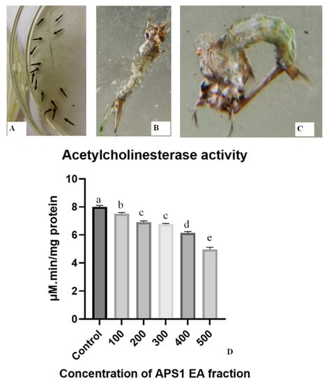 (A,B) Fourth instar larvae of Aedes aegypti after treatment with APS1 EA extract; (C) treated larvae showing degradation of body segments and (D) coiling of the larvae occurs; (D) Inhibition of the acetylcholinesterase (AchE) enzyme in the case of Aedes aegypti fourthinstar larvae after treatment with APS1 EA extract. Statistical values with same letter are not significantly different (according to Tukey’s HSD test at p < 0.05 (one way ANOVA)). Values on the graphs are the means ± Standard error (SE) of the three replicates. Tukey’s multiple comparison test was performed. The different letters a, b, c, d, e and f indicates significance difference in comparison to control (At, p < 0.05).