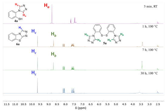 We were interested in following the conversion of thiol 4a to compound 6a by NMR to confirm the disulfide intermediate 5a detected previously by LCMS. Therefore, compound 4a was dissolved in DMSO-d6 and an 1H NMR was recorded immediately after the addition of the solvent. This NMR showed the presence of a singlet at 8.78 ppm (Ha), which was assigned to the triazole C-H of the free thiol 4a (Figure 2, 5 min RT). The NMR reaction tube was then heated to 100 °C, and a second 1H NMR was measured after 1 h, which showed the presence of two new singlets at 9.64 (Hc) and 8.70 ppm (Hb). The singlet at 9.64 ppm corresponded to Hc of heterocycle 6a, while the singlet at 8.70 ppm was assigned to Hb of the disulfide intermediate 5a. LCMS of the NMR solution confirmed the presence of these two molecules, while no free thiol was detected. After 30 h, the disulfide 5a was consumed completely, and only the compound 6a was observed by both NMR and LCMS.