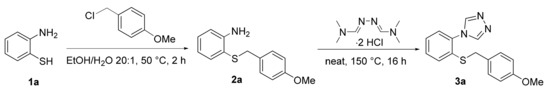 Triazole, 3a, was prepared according to the literature procedure shown in Scheme 2 [46,48]. While the p-methoxybenzyl-protected aniline, 2a, could be obtained in this case by protecting 2-mercaptoaniline, 1a, under argon atmosphere, the lack of commercial availability of substituted 2-mercaptoanilines required the development of a different synthesis route. An obvious method for introducing a sulfur substituent on an aromatic ring would be a classical nucleophilic aromatic substitution using a 2-halonitrobenzene derivative starting material [49,50,51]. Subsequent reduction of the nitro group would afford the corresponding aniline derivative.