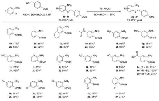 Preparation of protected 2-mercaptoanilines, 2b–2r. aIsolated yields of p-methoxybenzyl-protected 2-mercaptonitrobenzene derivatives, 1b–1r. bIsolated yields of protected 2-mercaptoanilines, 2b–2r. cPrepared from tert-butyl(4-fluoro-3-nitrophenoxy)dimethylsilane. dPrepared from 1m.