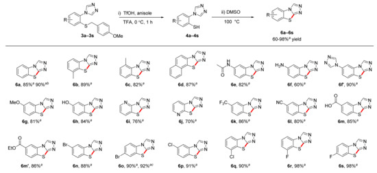 Formation of benzo[4,5]thiazolo[2,3-c][1,2,4]triazole derivatives 6a–6s in two steps from 3a–3s. aIsolated yields for reactions carried out on a 0.25–1 mmol scale, b5 mmol scale, and c10 mmol scale.