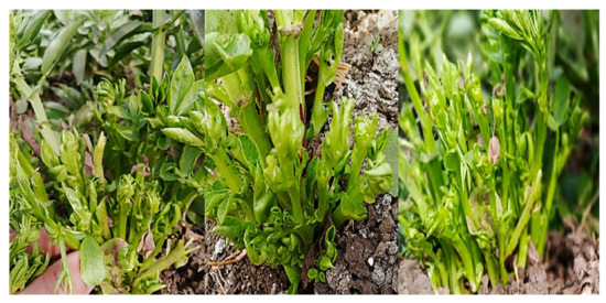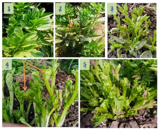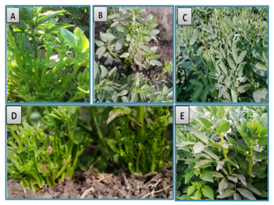 Various plant diseases (e.g., fungal, bacterial, viral, etc.) have been documented to infect this crop. Phytoplasma-related disease is considered as one of the most severe in yield-reduction worldwide [4]. Phytoplasma refers to microscopic, phytopathogenic, cell wall-less prokaryotes of the Mollicutes class that were previously designated as mycoplasma-like organisms. They are obligate parasites that inhabit host plant phloem tissue and insect host hemolymph. They are persistently transferred to other plants by phloem-sucking insects such as leafhoppers, plant hoppers, and psyllids [5]. Phytoplasma has been shown to be associated with the faba bean. The most common symptoms of phytoplasma infections of the faba bean are phyllody, shortening of internodes, flower virescence, witches’ broom, small leaves, and yellowing symptoms [6,7,8,9,10].