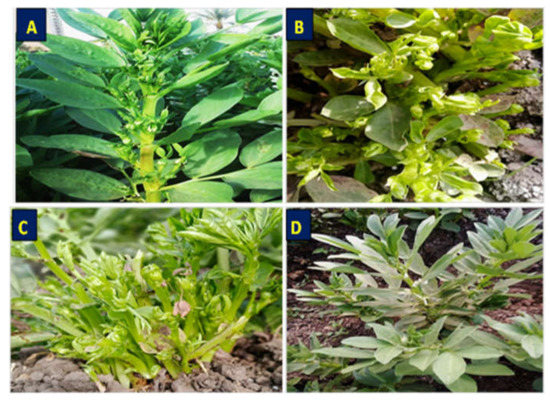 Naturally infected faba bean plants showing phytoplasma disease; (A) phyllody symptoms; (B) yellowing and little leaves; (C) shoot proliferation, witches’ broom, and stunting, and (D) asymptomatic faba bean plant.