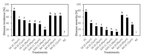 Results in Table 2 and Figure 7 showed that the percentage of disease severity decreased significantly to 12% in response to foliar application with 1.68 µM GAS-NPs compared to 76.2% in the positive control. Foliar treatments with different concentrations of GAS-NPs showed significant decrease in disease severity compared to that with other treatments with SA-NPs, BA-NPs, and positive control. The percentage of disease incidence recorded 20% in the exogenous application of GAS-NPs with 1.68 µM compared to 79.6% in the positive control, while the higher concentration of SA-NPs and BA-NPs showed 40.2% and 63.8%, respectively, of disease incidence.