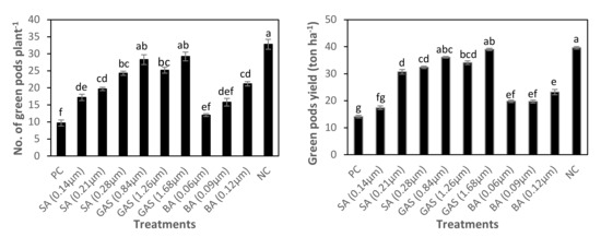 As shown in Table 4 and Figure 9, the phytoplasma infection caused considerable reductions in faba bean shoots fresh weight by 70%, shoots dry weight by 72%, number of green pods plant by 71%, and green pods yield by 65% compared with those of uninfected plants (NC). All foliar-applied nanoparticles particularly GAS-NP alleviated the negative effects of phytoplasma infection on shoots biomass and green pods yield of Vicia faba plants. Under phytoplasma infection, exogenous application of GAS-NP at 1.68 µM induced recovery of the biomass and yield reduction occurred through inducing significant increases in the shoots fresh weight (by 230%), shoots dry weight (by 244%), number of pods per plant (by 202%) and green pods yield (by 178%) compared to infected plant non-sprayed with nanoparticles (PC), and recorded similar values to the healthy plants (NC) (Table 4, Figure 9).