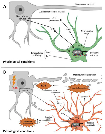 Involvement of non-cell-autonomous processes in ALS. (A) Under physiological conditions astrocytes perform a variety of neuroprotective tasks toward motoneurons from axon guidance and synaptic support, to the control of the blood brain barrier and blood flow, from the maintenance of extracellular potassium levels to the removal of the neurotransmitter glutamate. Astrocytes provide Nrf2-mediated antioxidant protection of motoneurons by supplying GSH and GSH precursors to motoneurons thus protecting them from oxidative stress [81]. (B) Under ALS-related pathological conditions, astrocytes change their morphology and properties and become “reactive astrocytes”. They release toxic factors and inflammatory mediators and promote glutamate excitotoxicity [16]. Impairment in the Nrf2 pathway at the astrocytic level, which does not allow the supply of GSH and its metabolites to motoneurons, is also associated with reactive astrocytes [1]. ALS, amyotrophic lateral sclerosis; ROS, reactive oxygen species; GSH, reduced glutathione; Gln, glutamine; Glu, glutamate; Nrf2, nuclear factor erythroid 2–related factor 2; ARE, antioxidant responsive element (created with BioRender.com, accessed on 17 February 2022).
