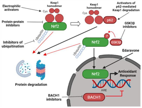 Several alternative ways can also be exploited to stimulate the Nrf2 pathway. Nrf2 activation can be achieved (i) by the inhibition of Nrf2 transcriptional competitors, such as the transcriptional factor BTB domain and CNC homolog 1 (BACH1), (ii) by the degradation of Keap1 mediated by the protein p62 or (iii) by the inhibition of proteins involved in Nrf2 degradation, such as glycogen synthase kinase 3 beta (GSK3β), β-Transducin Repeat Containing E3 Ubiquitin Protein Ligase (βTrCP), CR6-interacting factor 1(CRIF1), 3-hydroxy-3-ethylglutaryl-CoA reductase degradation protein 1 (HRD1), and WD repeat protein (WDR23) [1,82].