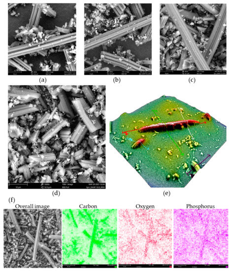 SEM micrographs of (a) DAHP-0, (b) DAHP-0.2, (c) DAHP-5.0, (d) DAHP-10 (magnification × 5000, field of view 53.6 μm, scale bar 10 μm), and (e) 3D reconstruction of individual small fiber debris showing diameter of ACFs of roughly 8 μm (magnification × 5000), (f) EDX mapping for sample DAHP-2.5 (magnification × 5000, field of view 53.6 μm, scale bar 10 μm).