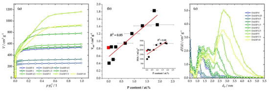 N2 adsorption isotherms (a), the correlation between Vtot and P content (inset gives the correlation between SSA and P content; lines give linear fit); red square stands for DAHP-0 sample (b), and derived PSDs (c) for the studied samples.